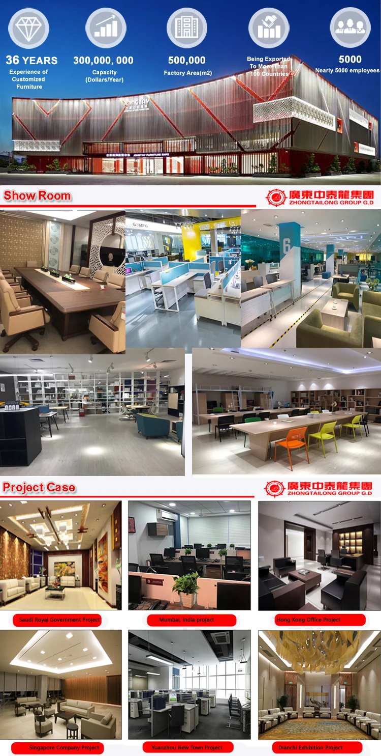 Zhongtailong Group Co.,ltd was established in 1983. Covered more than 500,000 square meters, employing more than 5,000 staffs. Gokeng Furniture has brought in some advanced Italy & German brand production equipment & testing equipment. Product includes solid wood, upholstery MFC, veneer and so on.Company from its early standing the" Strict requirements and High standards" concept, has passed certificate, for example: ISO9001: 2008 quality management system certification, ISO14001: 2004 environmental management system certification, ISO 14025: environmental mark product certification, FSC, High-tech Enterprise, CQC. Has been listed on China Top 10 Office Furniture Brand, International Standard Product Mark Certificate, Chinese Famous Brand, Guangdong Famous Trademark, Guangdong Famous Brand, China's Furniture Industry Ten Brands of Furniture.Since its foundation, Gokeng has been served over 80,000 customer from all over the world. From the beginning, Gokeng has set out to provide our customers with service, value and quality,integrity.