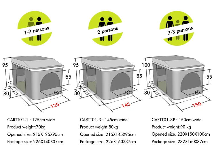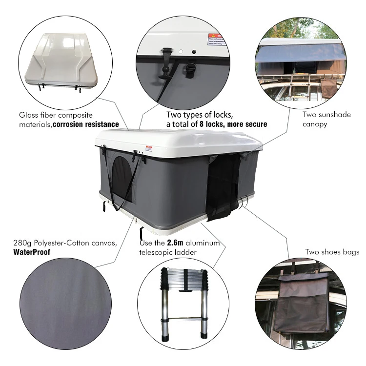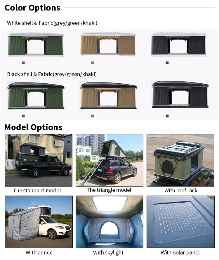 The 4x4 Camper Trailer Tent Hard Shell Car Roof Tent for Camping and Outdoor offers a new way to look at camping and 4WD adventure holidays. Our hard shell roof top tent has two doors with two windows, this creates excellent cross ventilation allowing air to freely circulate throughout the tent. Open and close within seconds with the unique hydraulic support system. Our hard shell roof top tent fit to the roof of most vehicles.