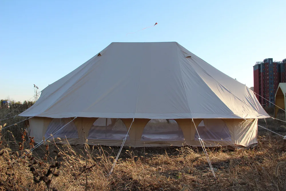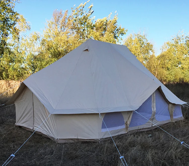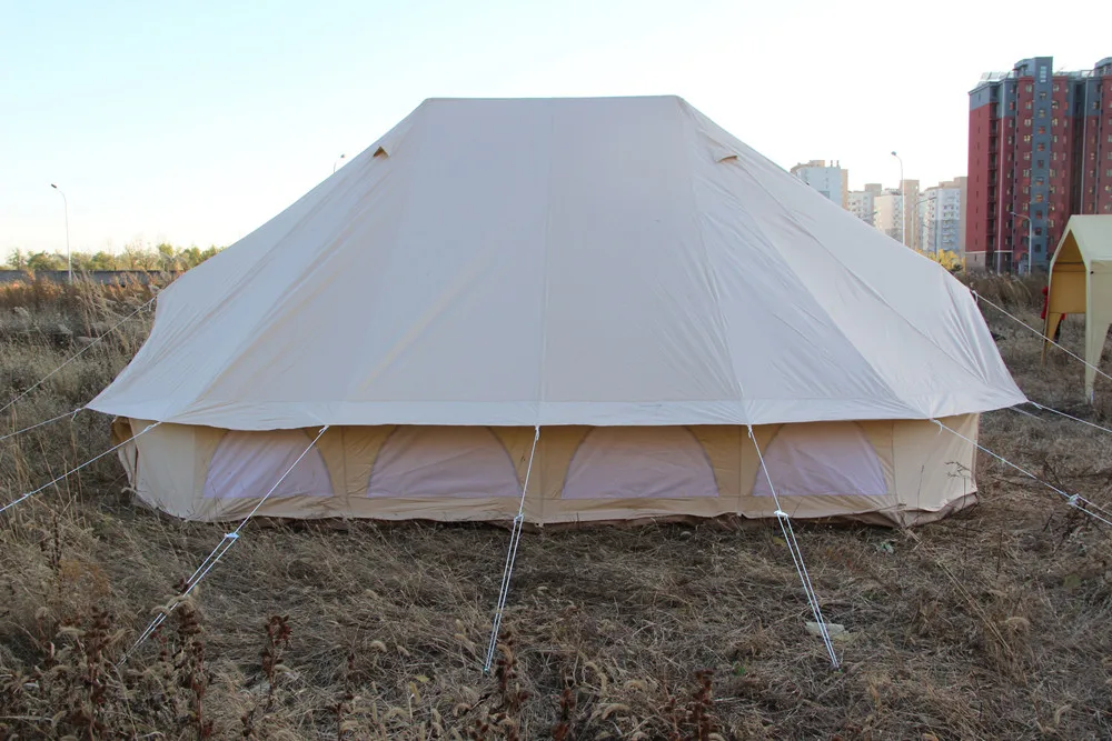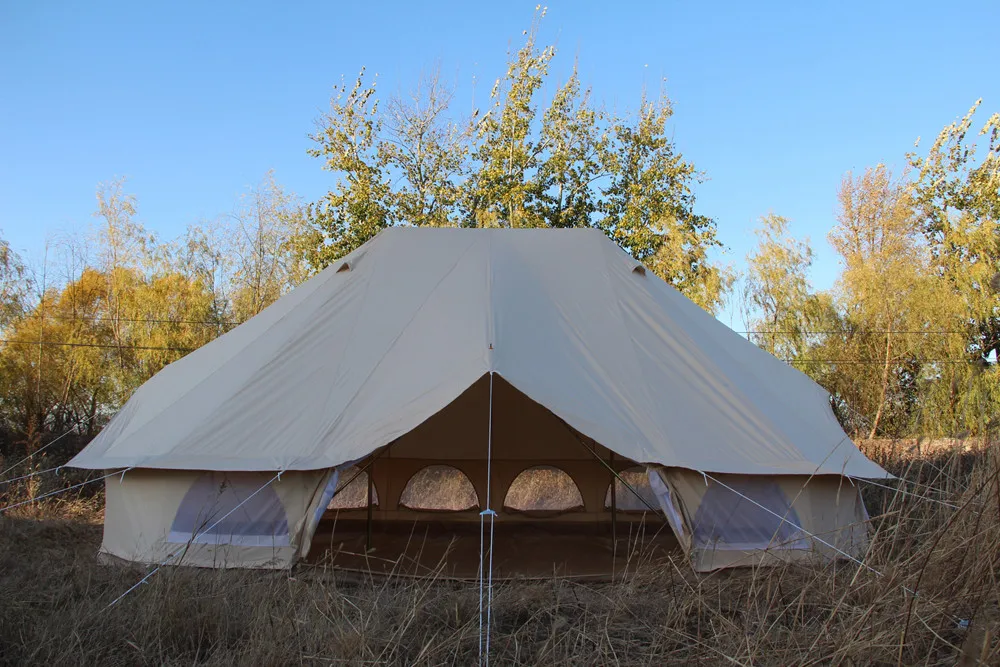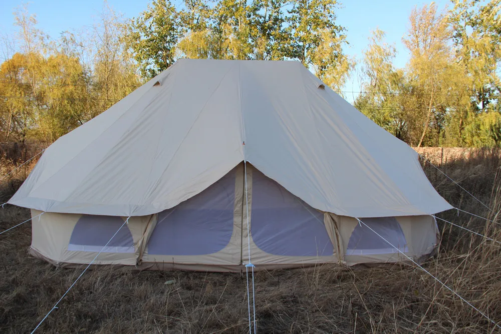Our Bell Tents are made from 300 gsm waterproof cotton canvas PU coating with a durable zip-in groundsheet. They have two spring-loaded poles - a central pole and an A-frame pole which creates a porch in the doorway. The tent has air vents, mesh windows with zips and an extra-large carry bag for easy packing. The zip-in groundsheet means that the sides can be rolled up on a hot day, making the bell tent a perfect sunshade and it also have four types, 3m, 4m, 5m, 6m. Custom sizes and colors can be accepted.Our cotton canvas fabrics have been through special treatment to be durable water proof for a long time using.