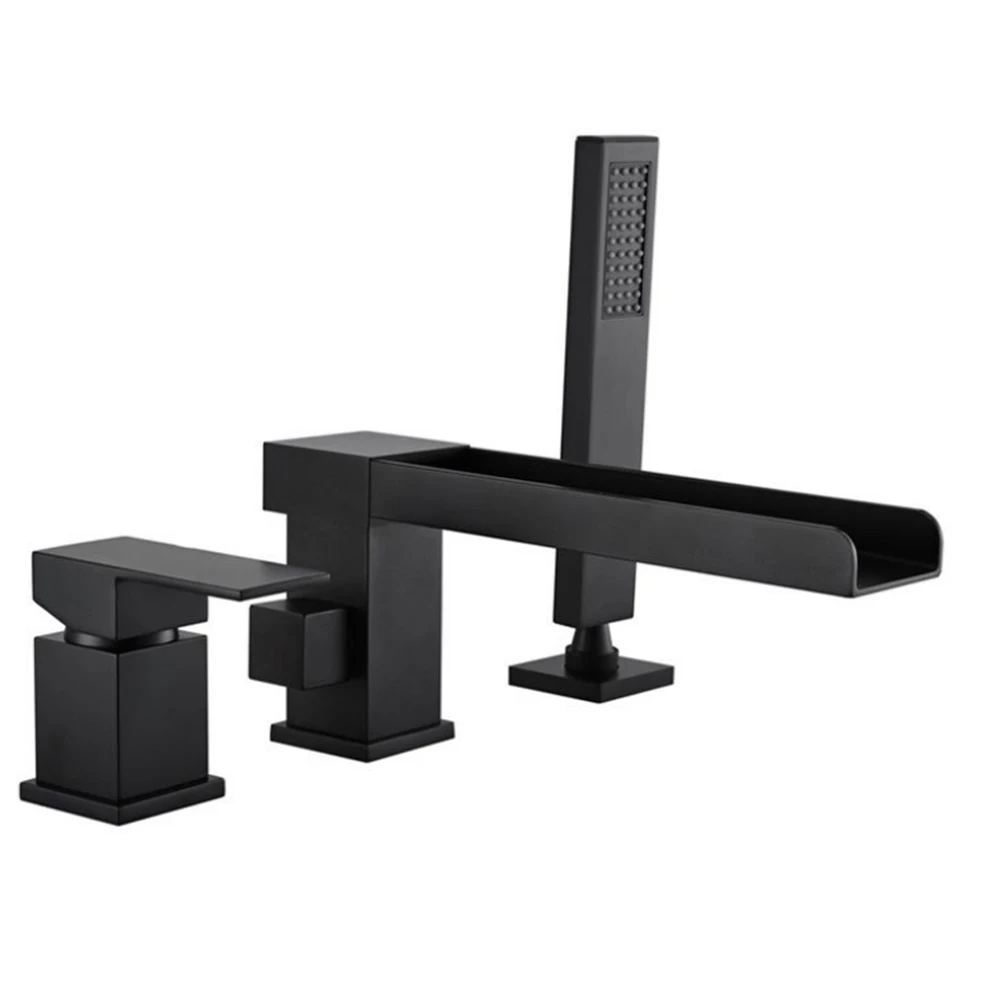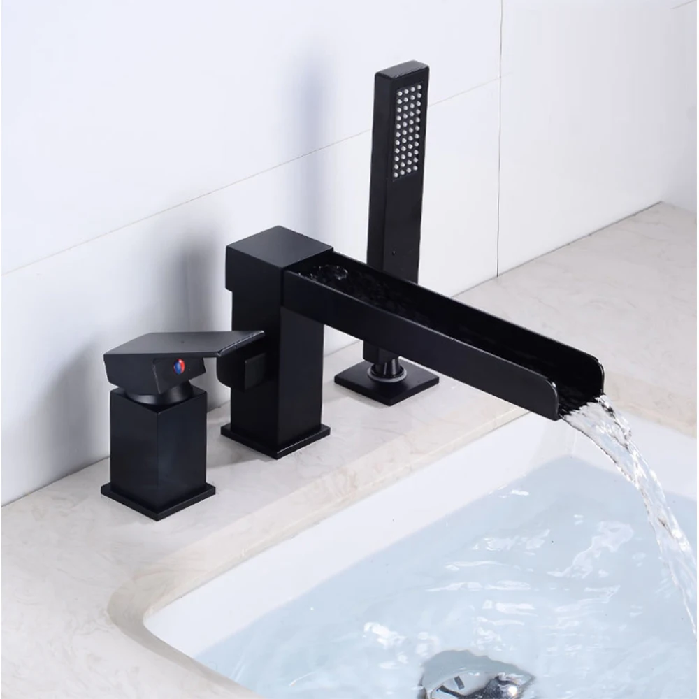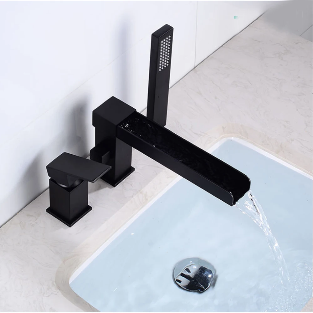 AVATAR Deck Mounted 3pcs Set Black Waterfall Bathtub Faucet with Hand Shower