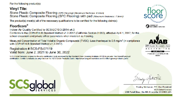 Our SPC flooring is of high quality and have passed kinds of professional tests. The following are some of the certificates we have obtained,including FloorScore, CE, ISO 9002, ISO14001, OHSAS 18001, etc..