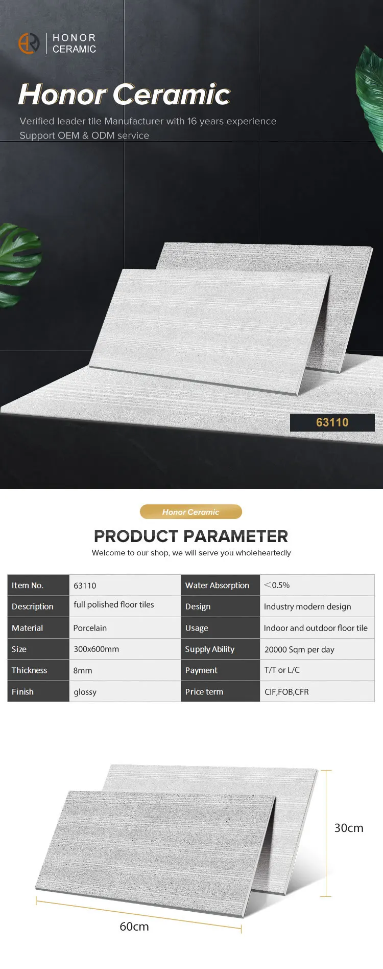 ZiBo honor manufacturer 300*600 grey matt bathroom ceramic wall tiles