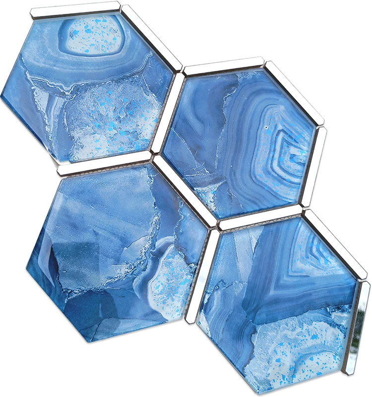 Customized mosaik fliesen laminated hexagonal silver blue wall ceramic stainless steel glass mosaics