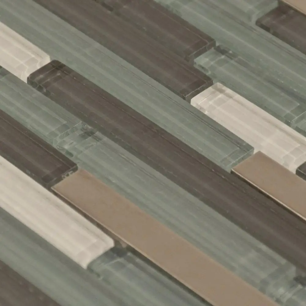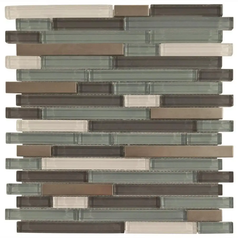 首页 石材、瓷砖、地板、墙面材料 马赛克 混合马赛克 Long strips green brown glass and metal mosaic for kitchen backsplash project