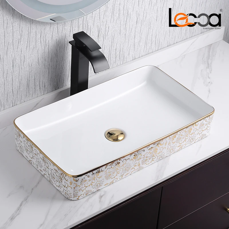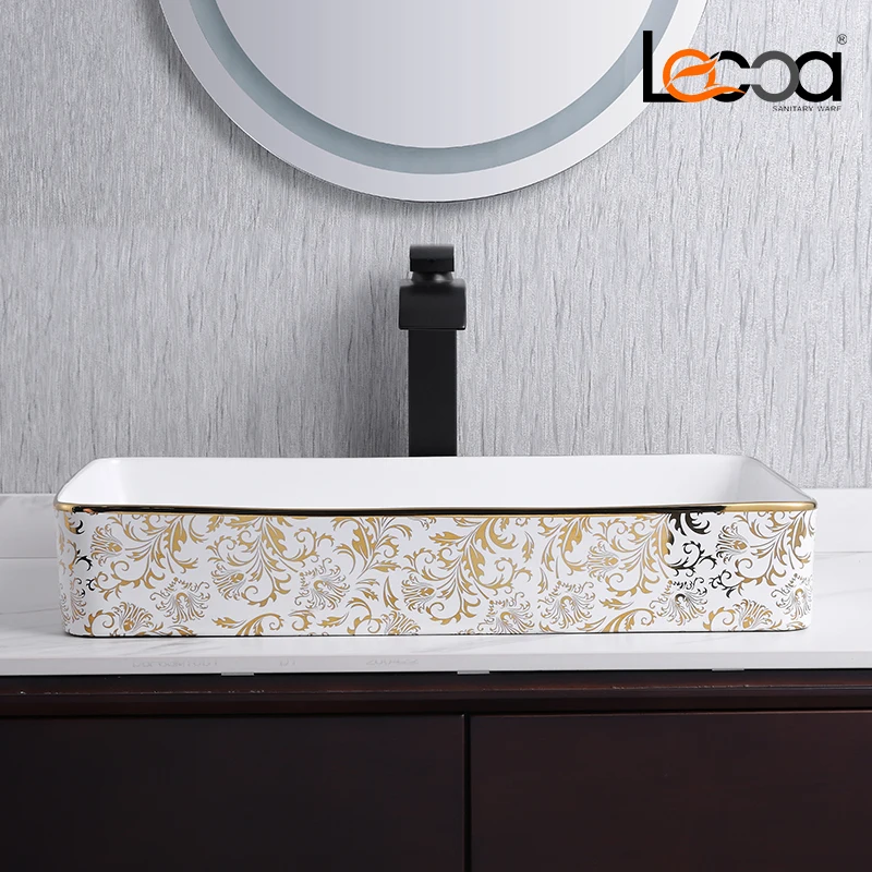 首页 浴室产品、水槽 洗手盆 Rectangular ceramic porcelain flower pattern plating gold art basin for home use