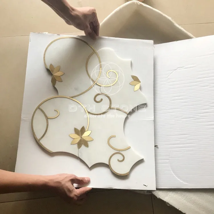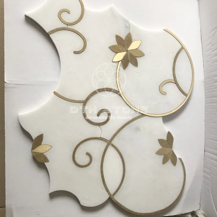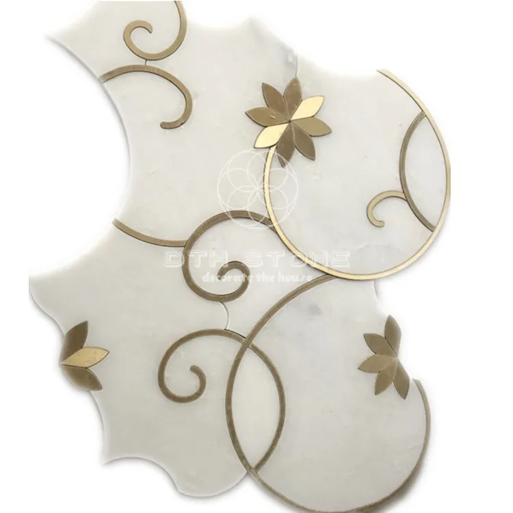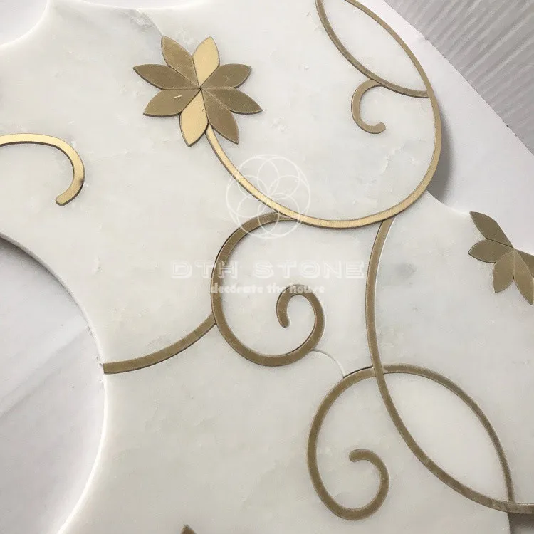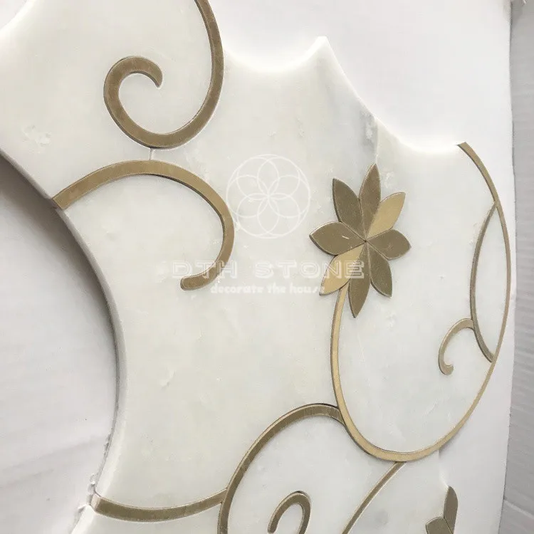 Dth stone Mosaic Interior Design Flower Pattern Oriental White Marble Waterjet Mosaic Tiles With Brass Inlay