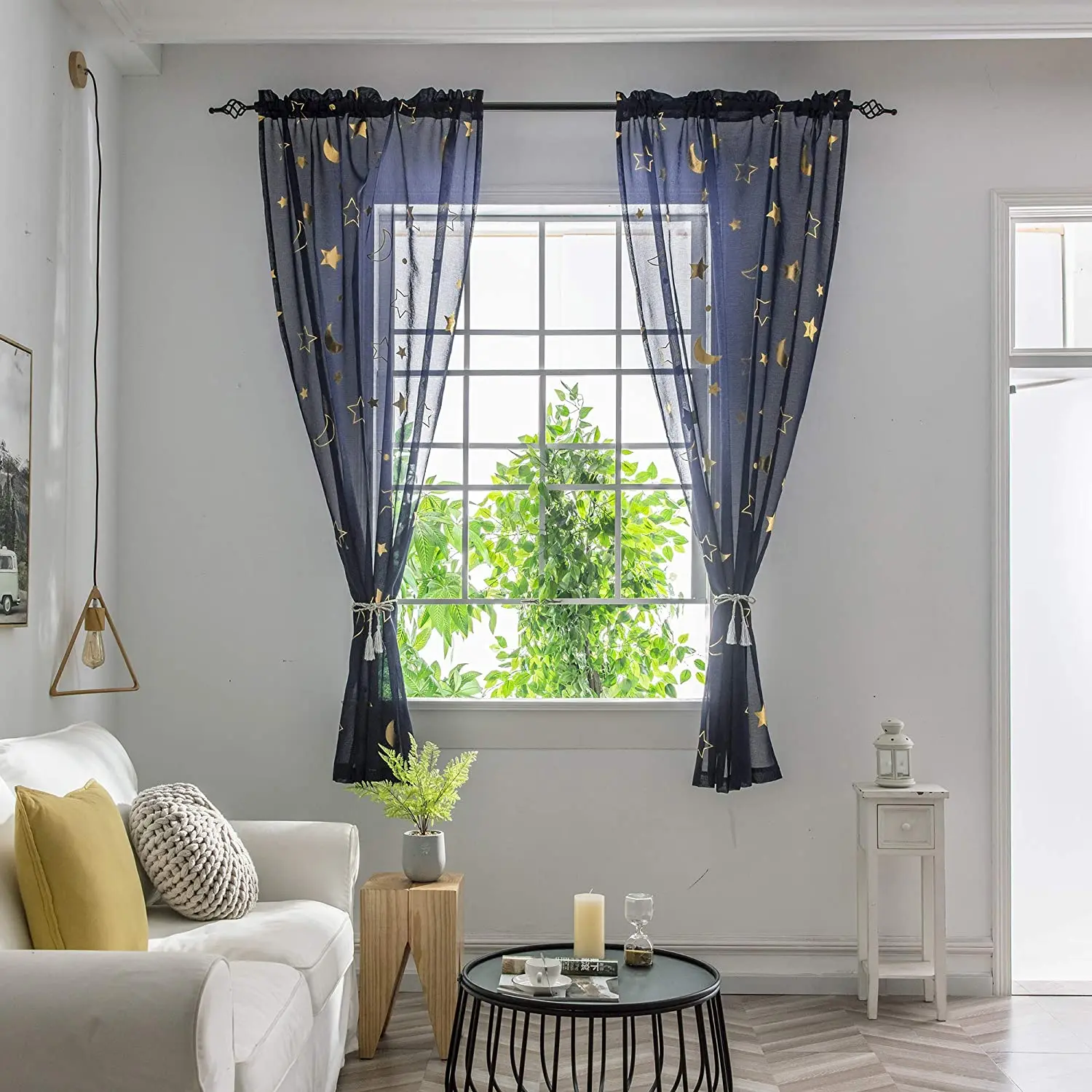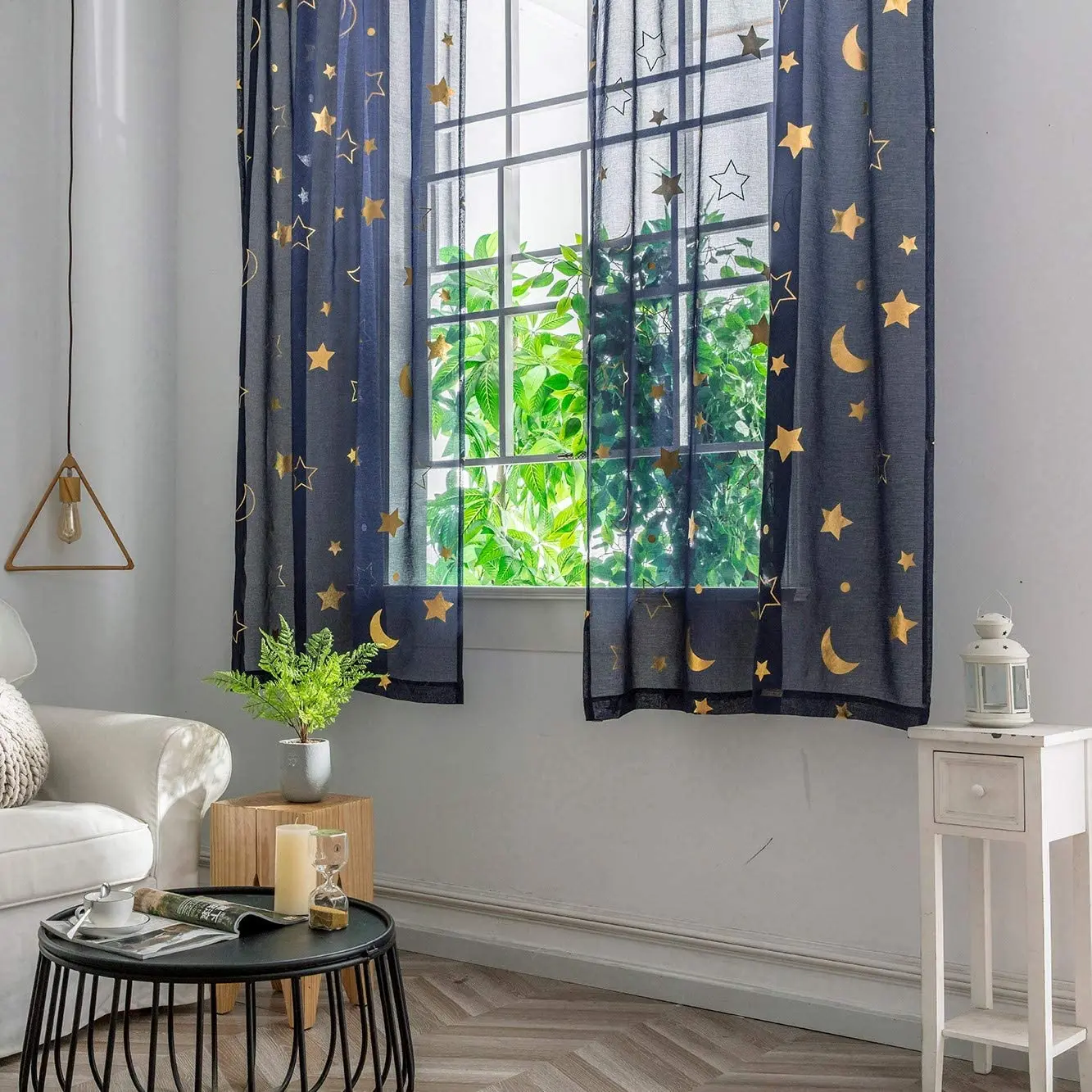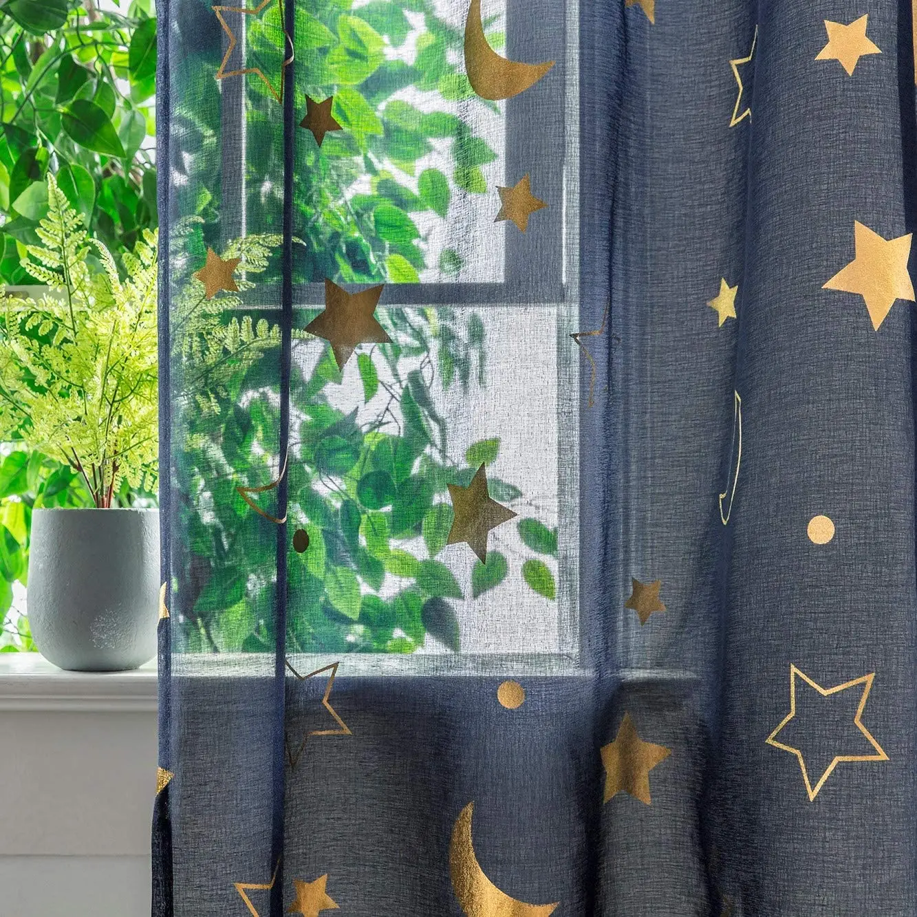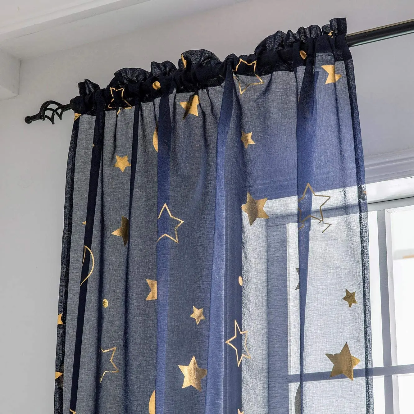 Navy Blue Gold Star Galaxy Curtains for Kids Room Short Kids Curtains for Girls Room Print Moon Gold Sheer Curtains for Bedroom