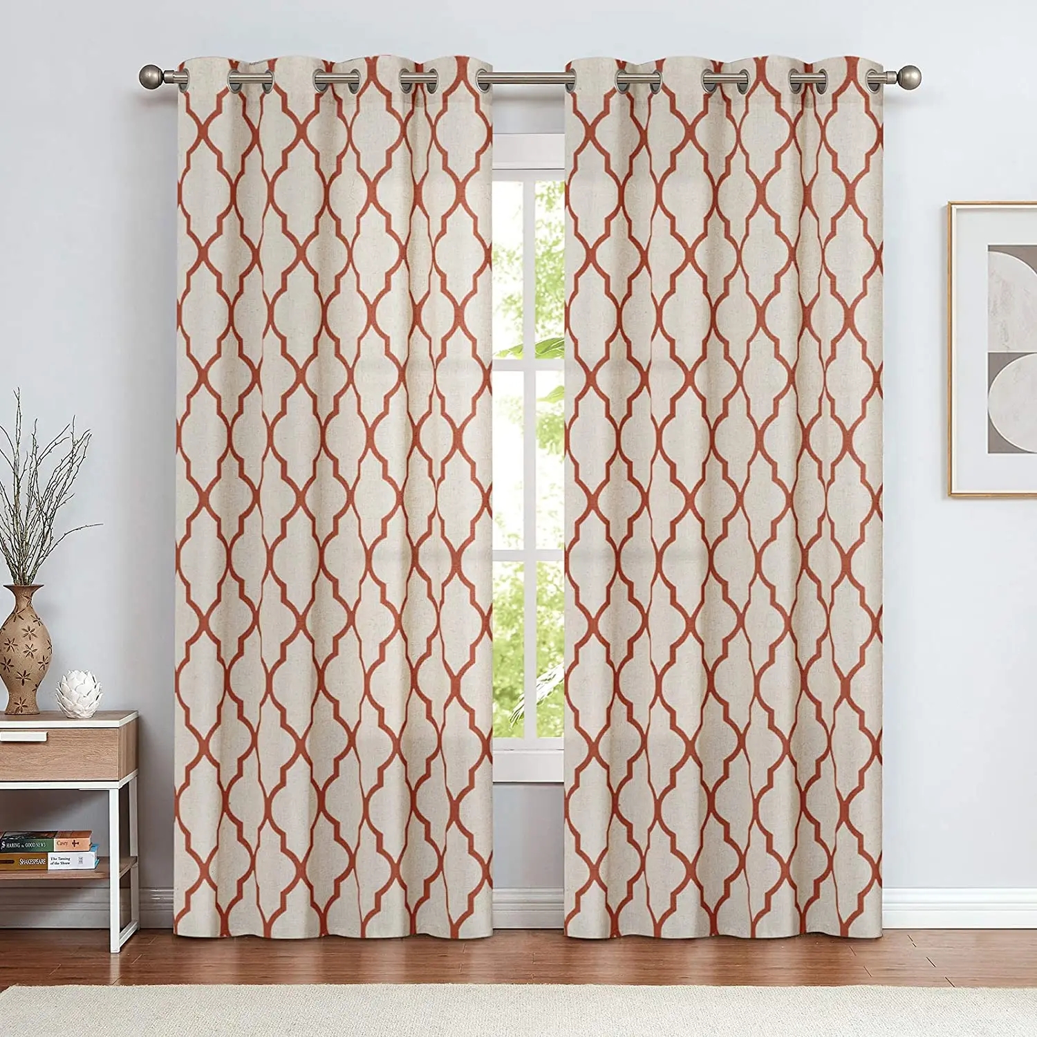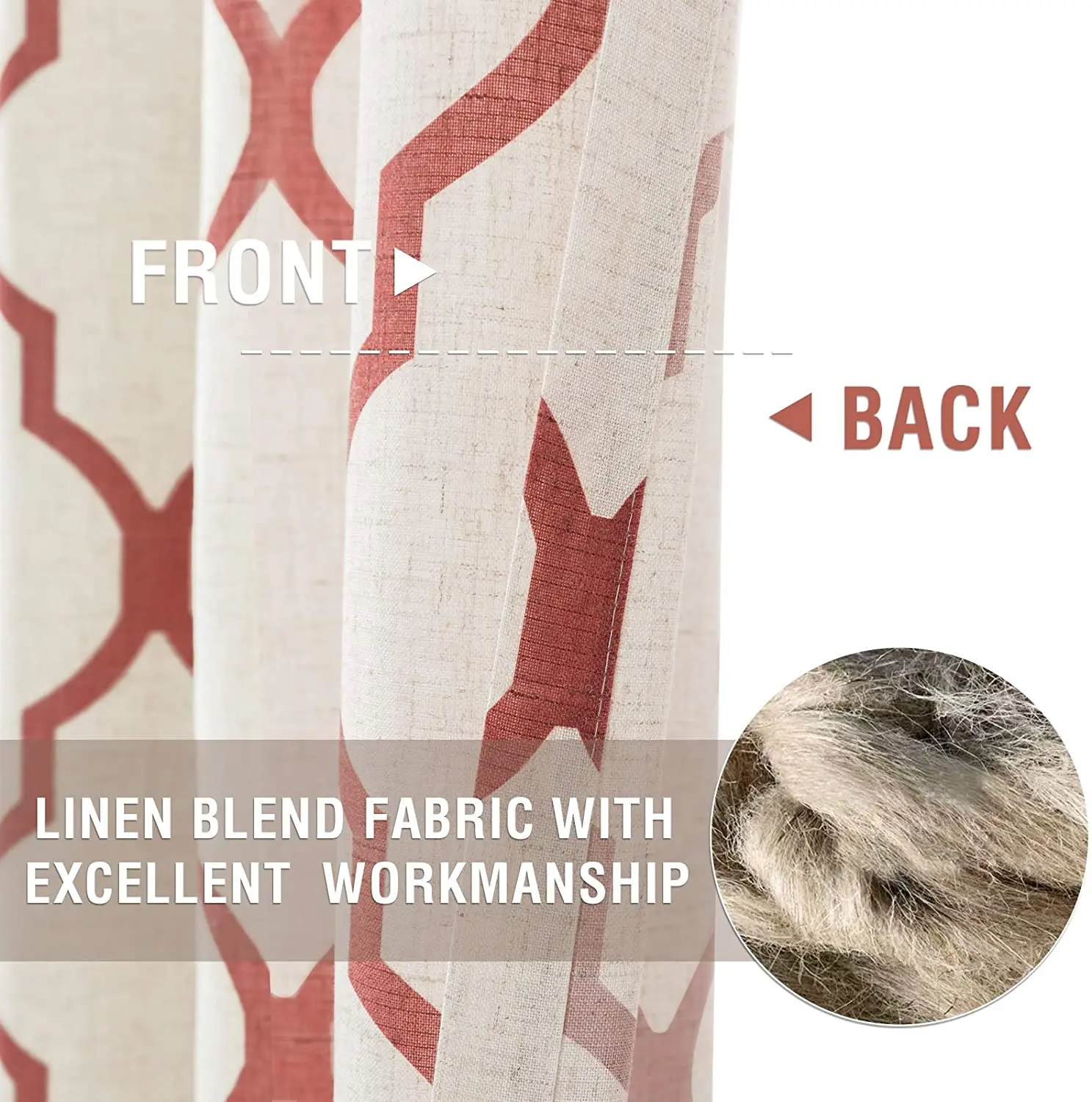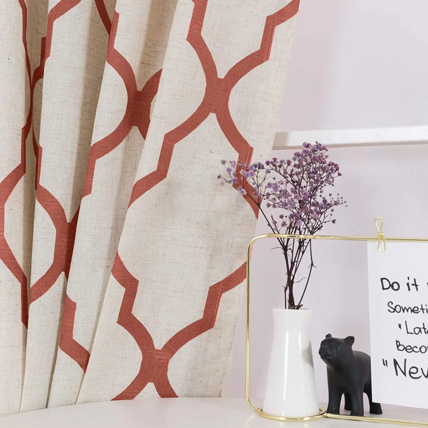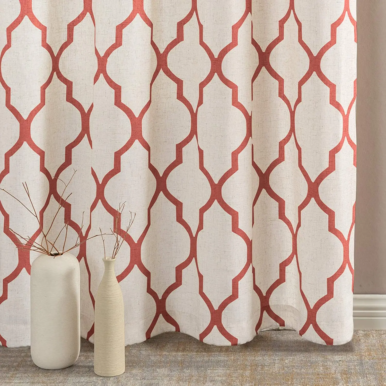 Red on Beige Moroccan Tile Print Curtains for Living Room Quatrefoil Flax Linen Blend Textured Geometry Lattice Grommets on top