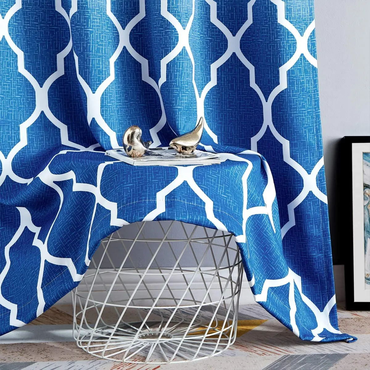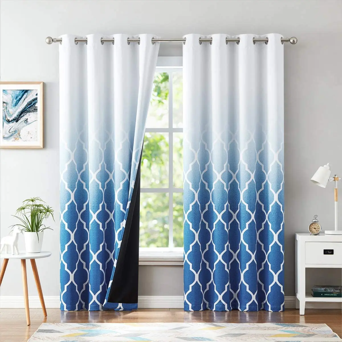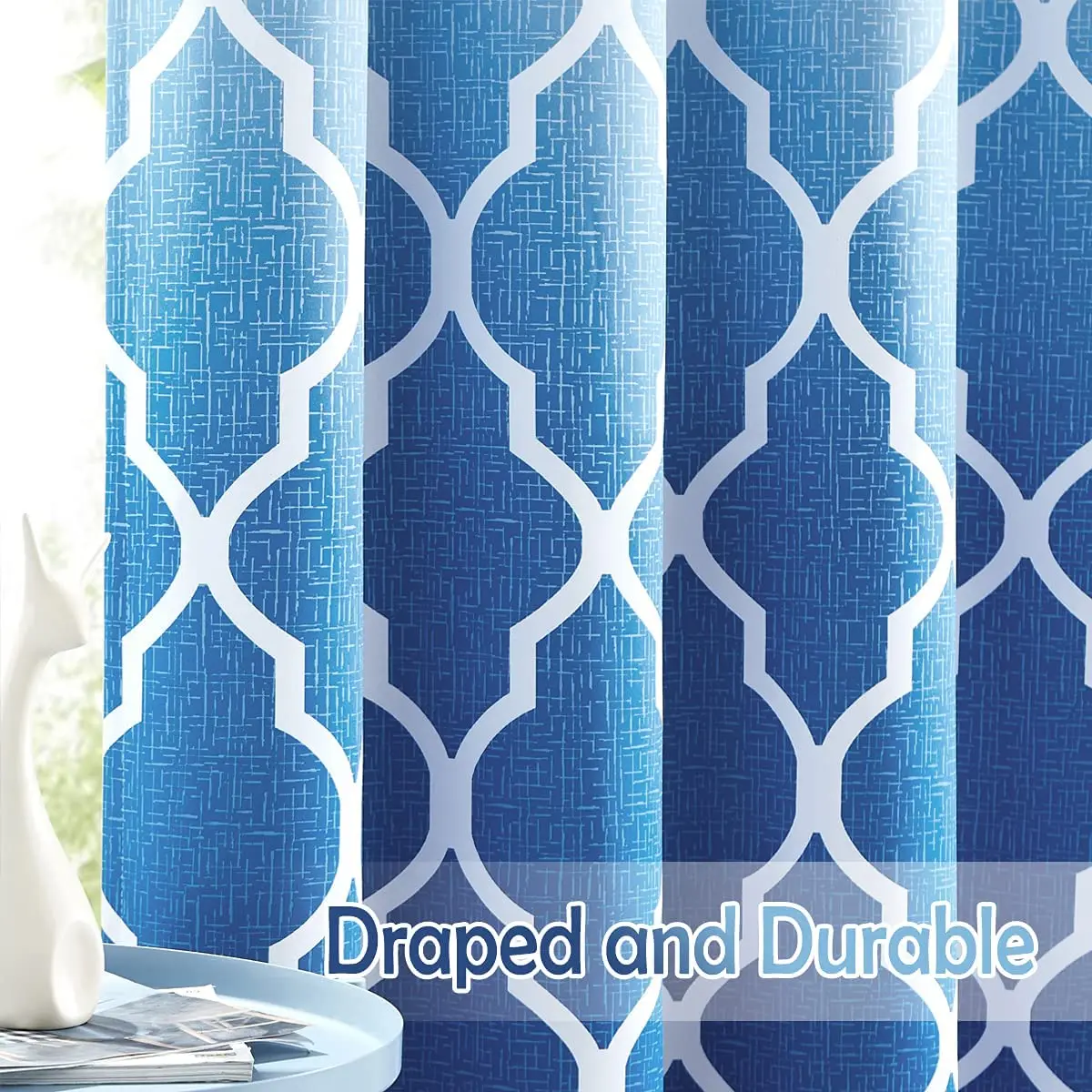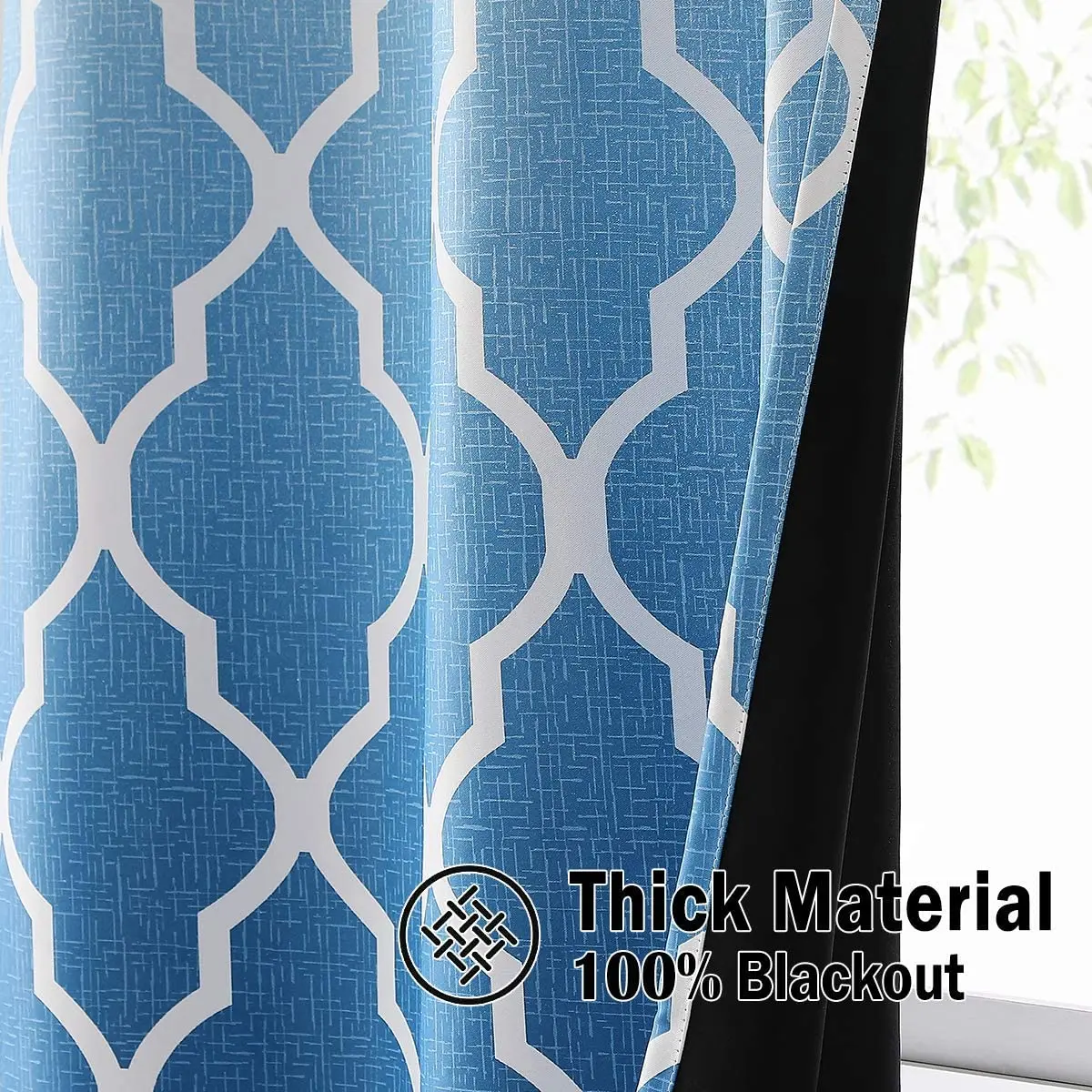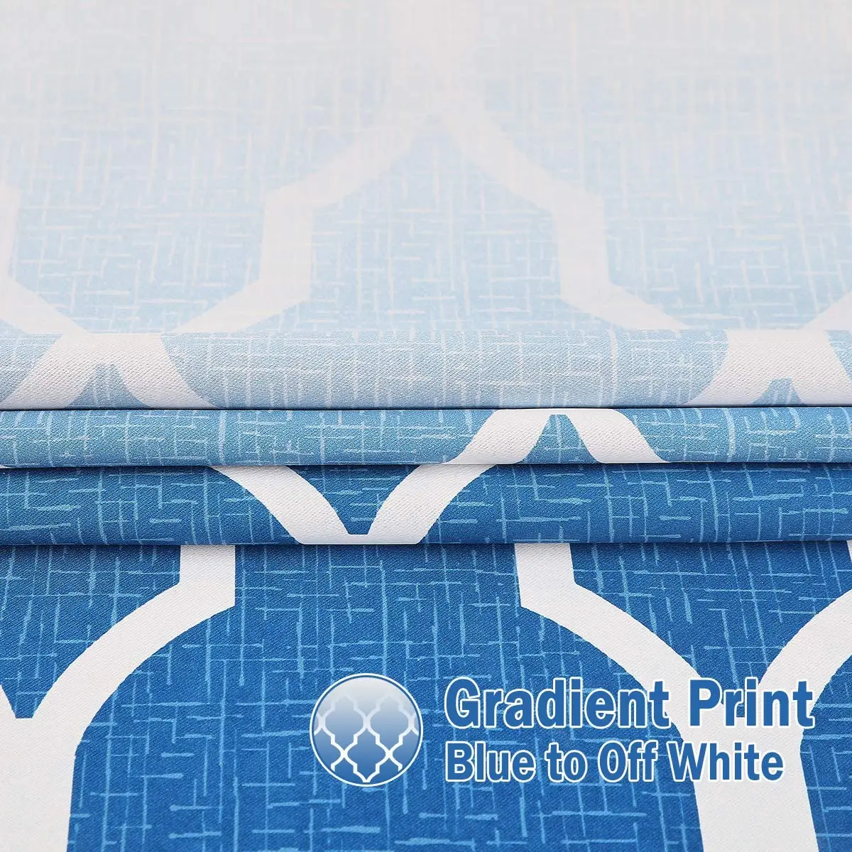 Blue Ombre 100% Blackout Curtains for Bedroom Living Room, Moroccan Pattern Printed on White Window Treatments Grommet Top