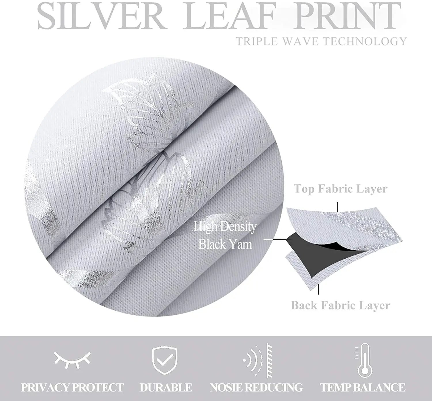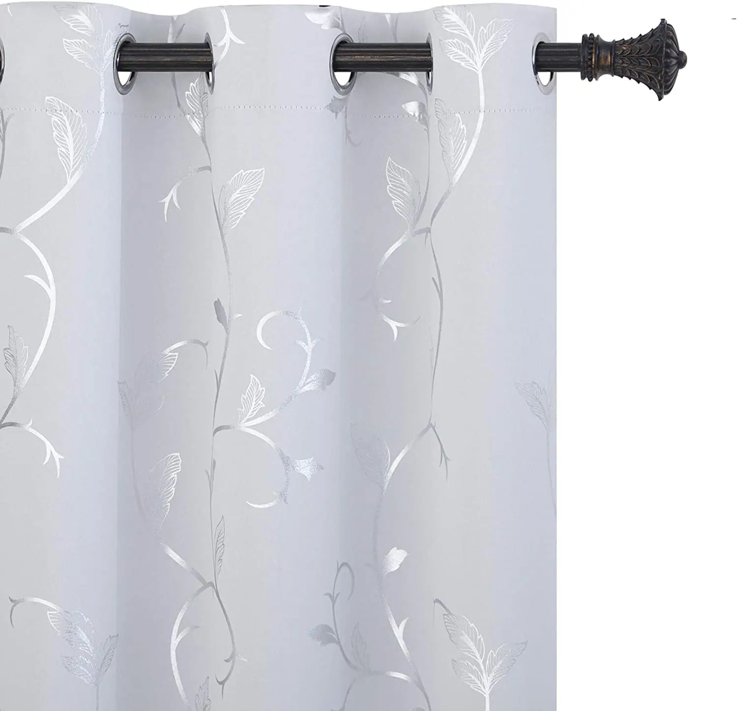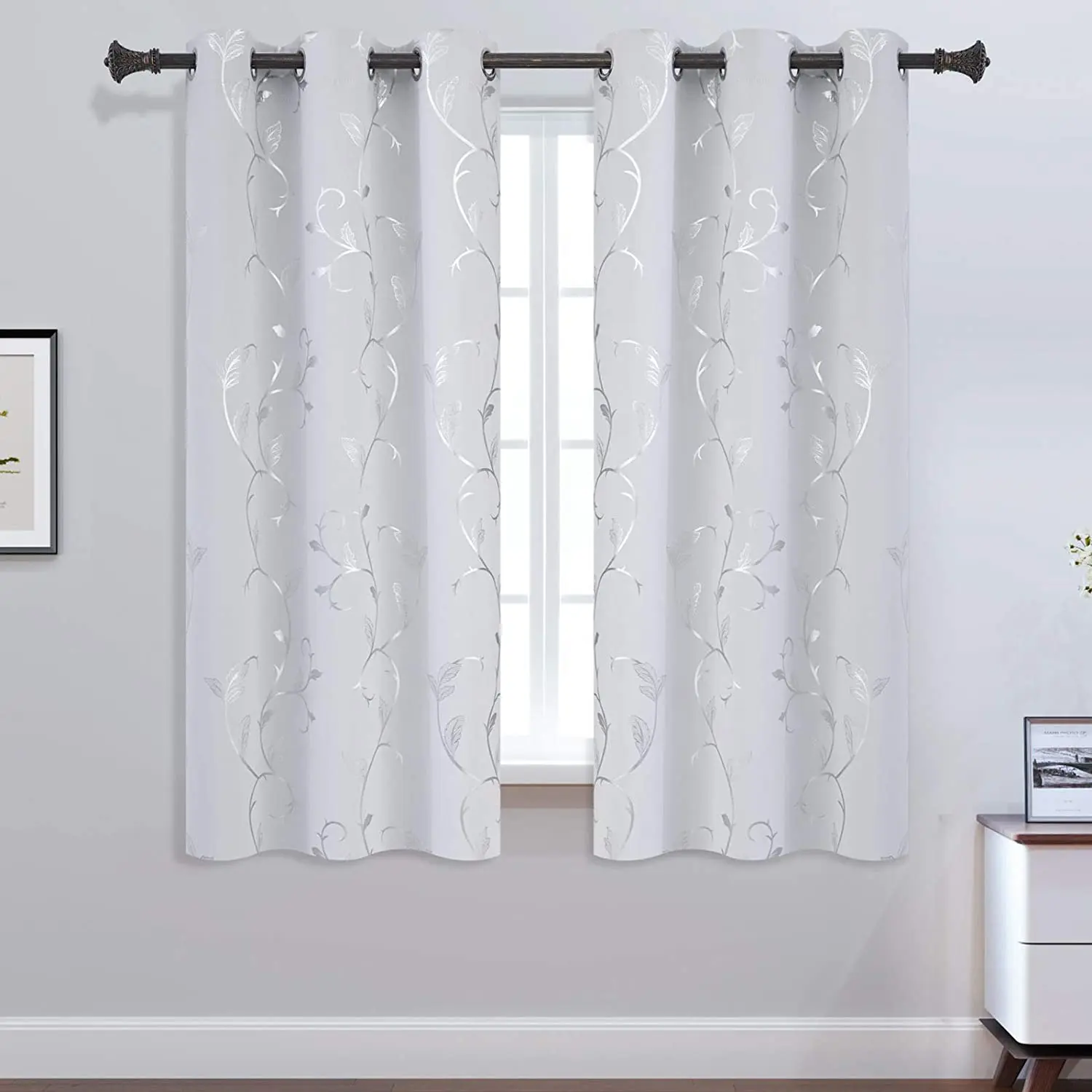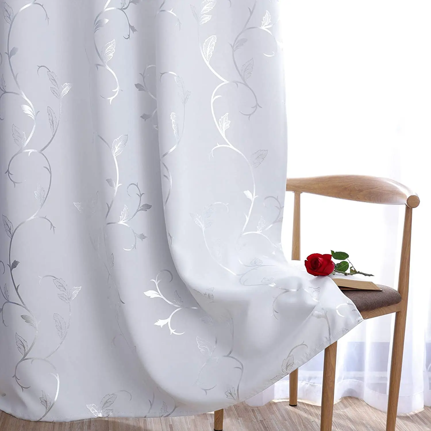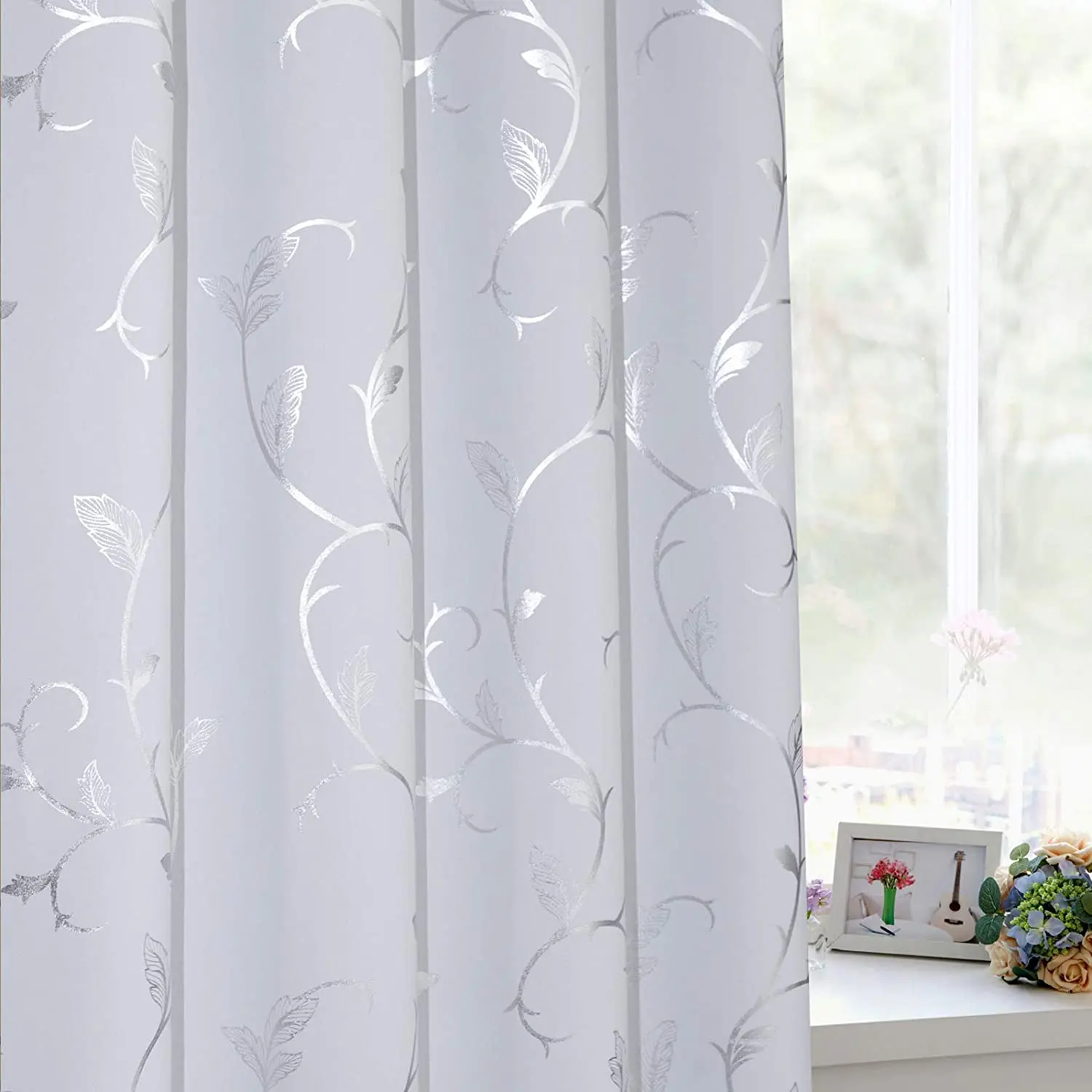 Greyish White Blackout Curtains with Shinny Silver Vine Print Thermal Insulated Room Darkening Curtains for Bedroom