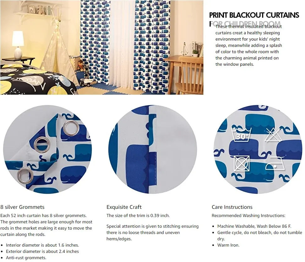 首页 门、窗、窗帘、标识标牌 窗帘及门帘 窗帘 Thermal Insulated Blackout Curtains Whale Print Room Darkening Window Drapes with Grommet for Toddler Room