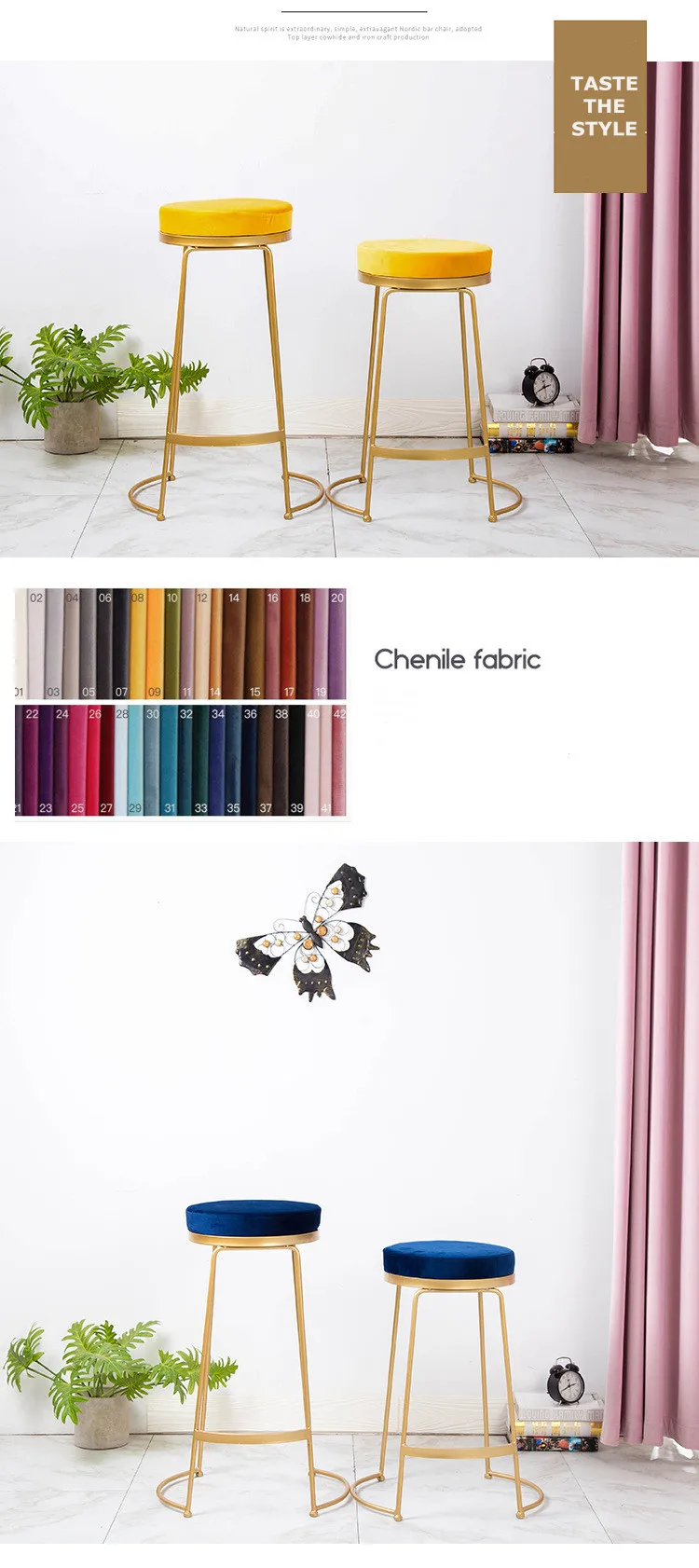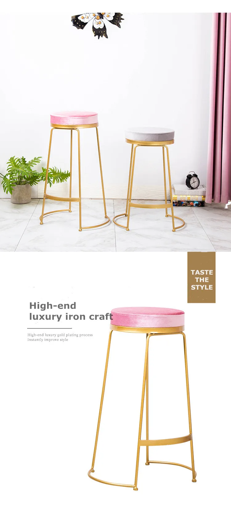 16.Simple design velvet cushion luxury firm structure creative fresh dining colorful high iron foot coffee Nordic bar stool