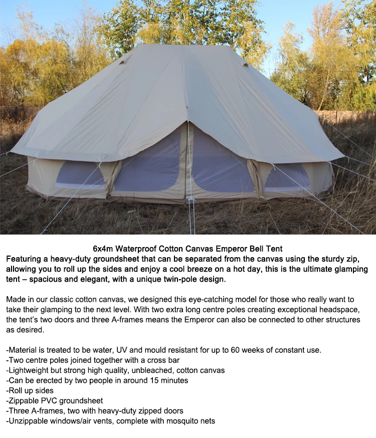 Featuring a heavy-duty groundsheet that can be separated from the canvas using the sturdy zip, allowing you to roll up the sides and enjoy a cool breeze on a hot day, this is the ultimate glamping tent-spacious and elegant, with a unique twin-pole design.