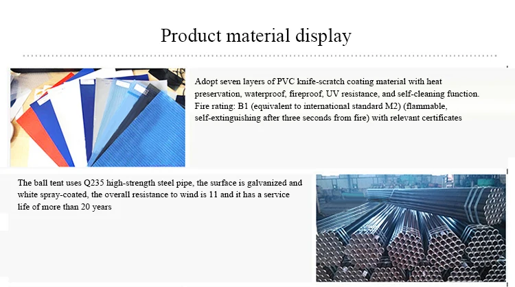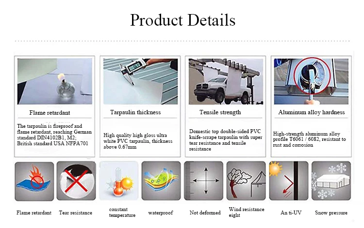 1.The outer layer is 850g / ㎡ PVC double-sided knife scraping film + 0.75mm transparent PVC film; the flame retardant level can reach DIN4102 B1, M2 standard, can withstand the temperature range of -30 ℃-+ 75 ℃, waterproof and UV protection; More than 8 years of life;