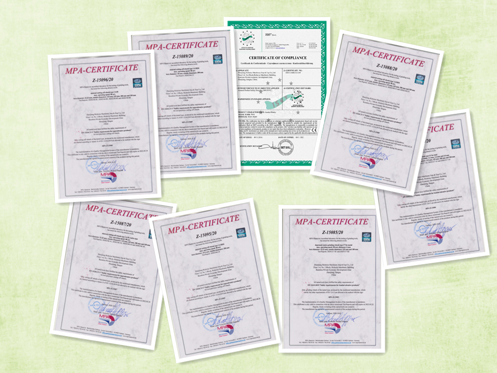 我们的金刚石锯片、TCT 锯片和砂轮已通过 MPA/EN、CE、GS 测试和证书,并且我们有